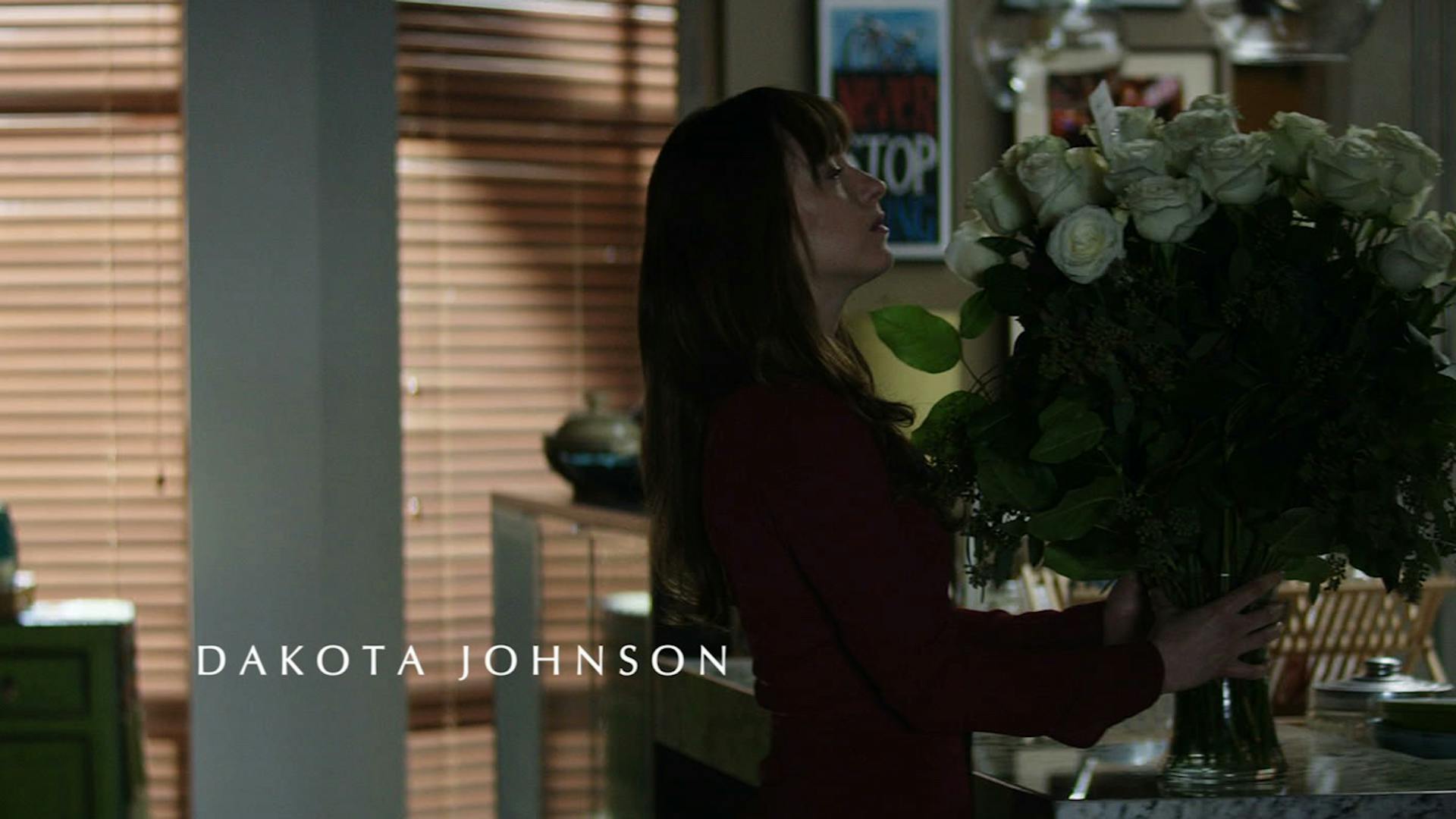 The Main Title sequence for Fifty Shades Darker opens on a sensuous macro shot of mysterious undulating curves. The camera pulls out to reveal that the curves are delicate petals of a bloomed white rose, thus introducing the film’s first scene of a bouquet of roses being delivered. Softly animated titles take the viewer through the rest of the opening, introducing the world of the seemingly lonely leading lady, Anastasia.