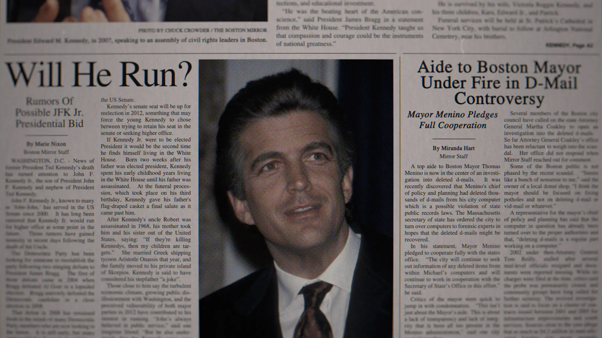 Unlike prior seasons, the montage is entirely digital—no analog artifacts—with more advanced broadcast graphics and a stronger emphasis on electronic media, reflecting the decline of print and a shift in how information is produced and consumed.