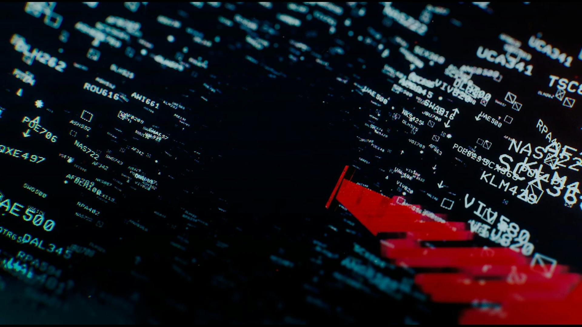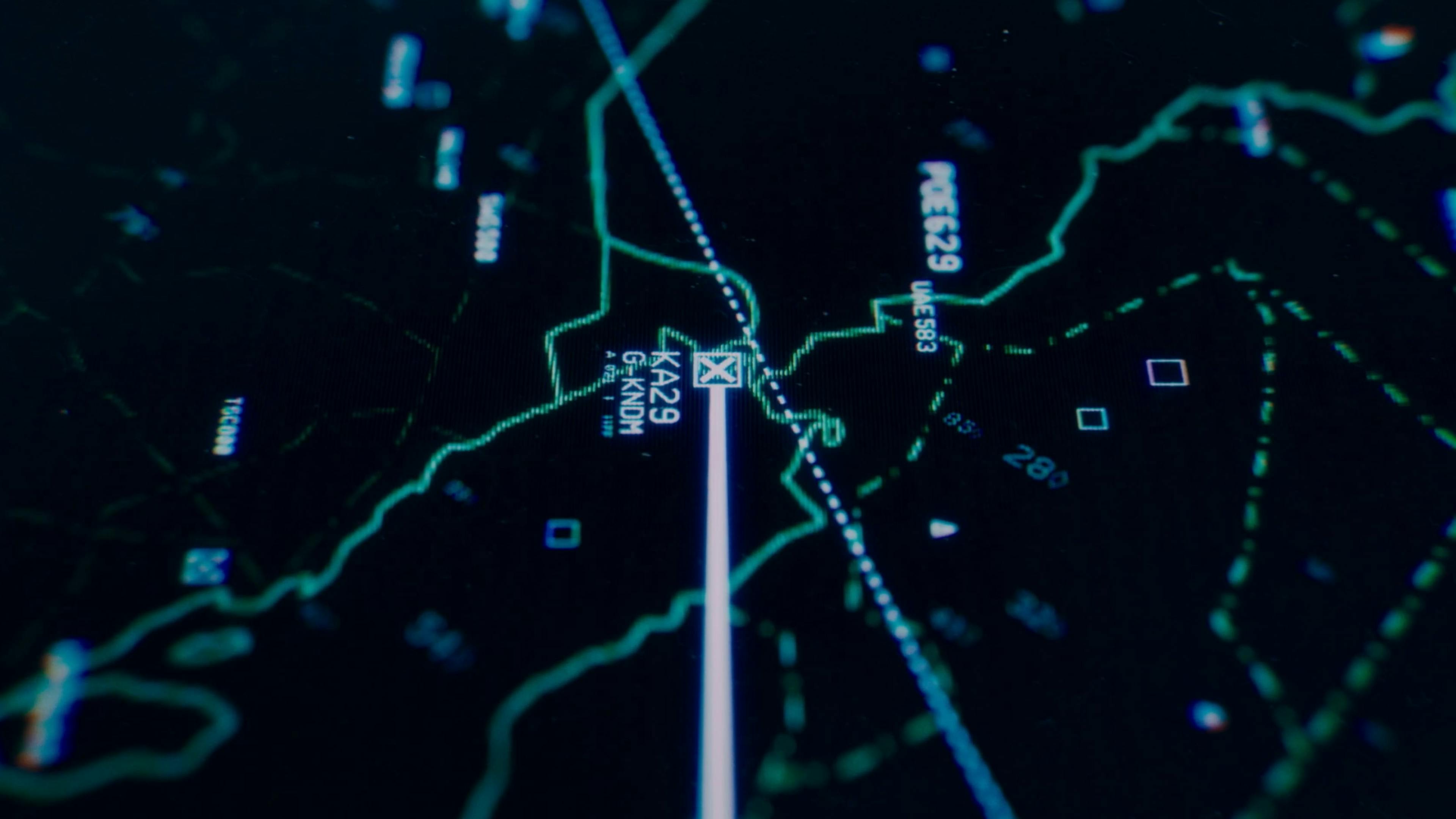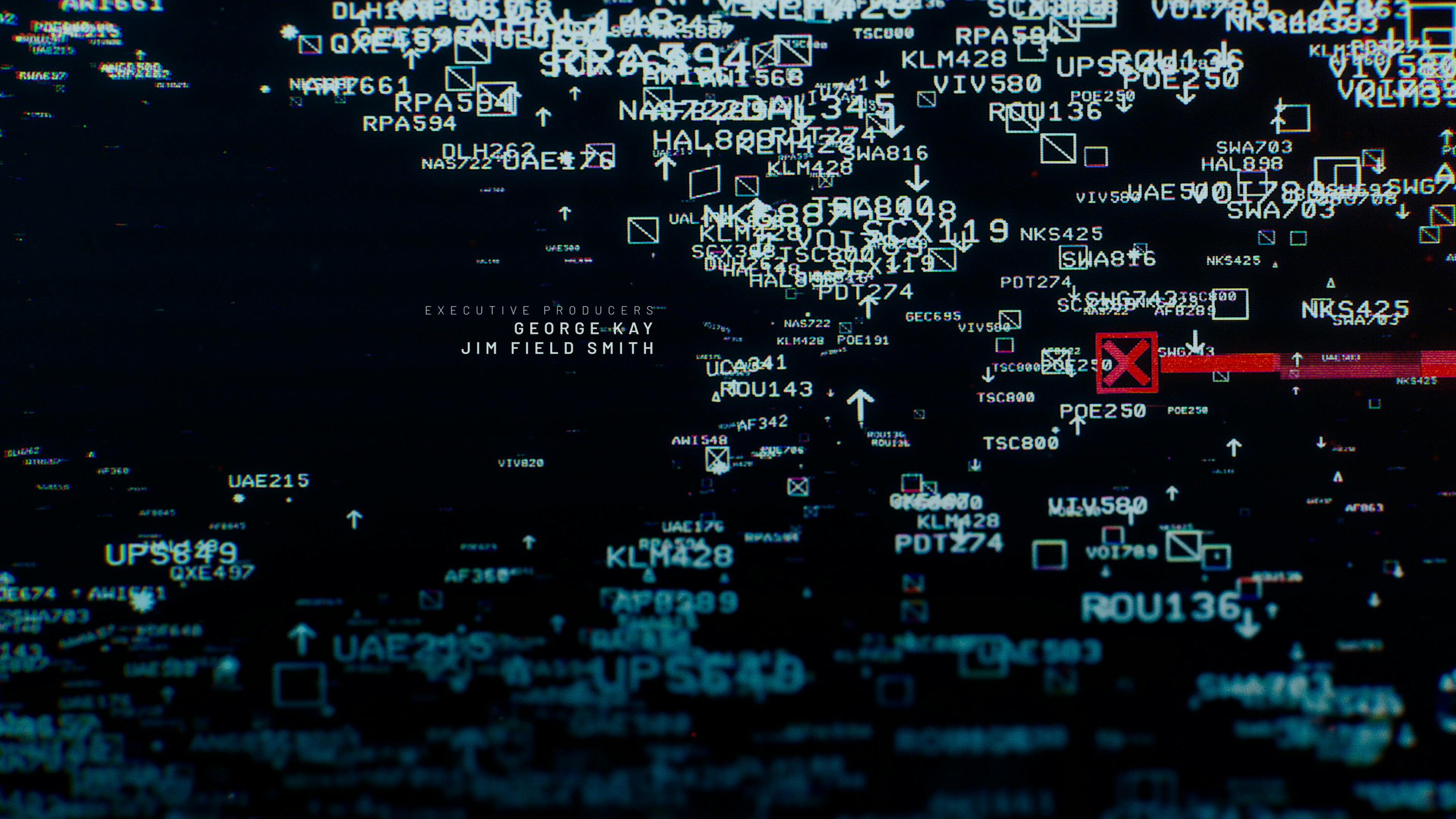 Hijack is a thriller series following the 7-hour flight of a hijacked plane. To set the stage for the tense, suspenseful show, the opening uses the visual language of digital flight tracking graphics. Amidst a sea of flights tracked by air traffic control, we follow a single line that turns from white to red: our hijacked plane. After navigating the complex web of airline numbers across multiple countries, the chaos of digital I.D.s coalesce to form the show’s logo.