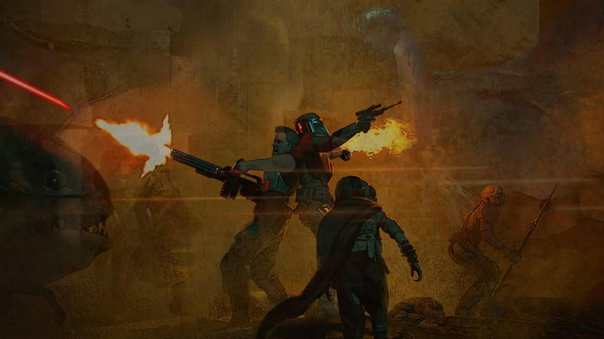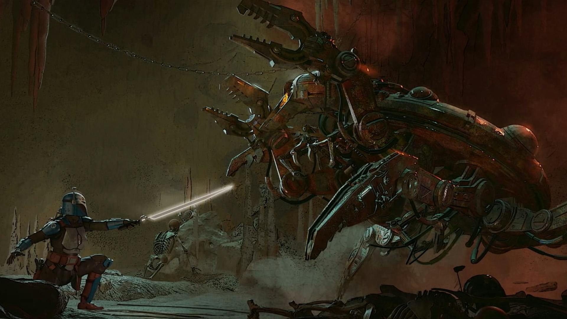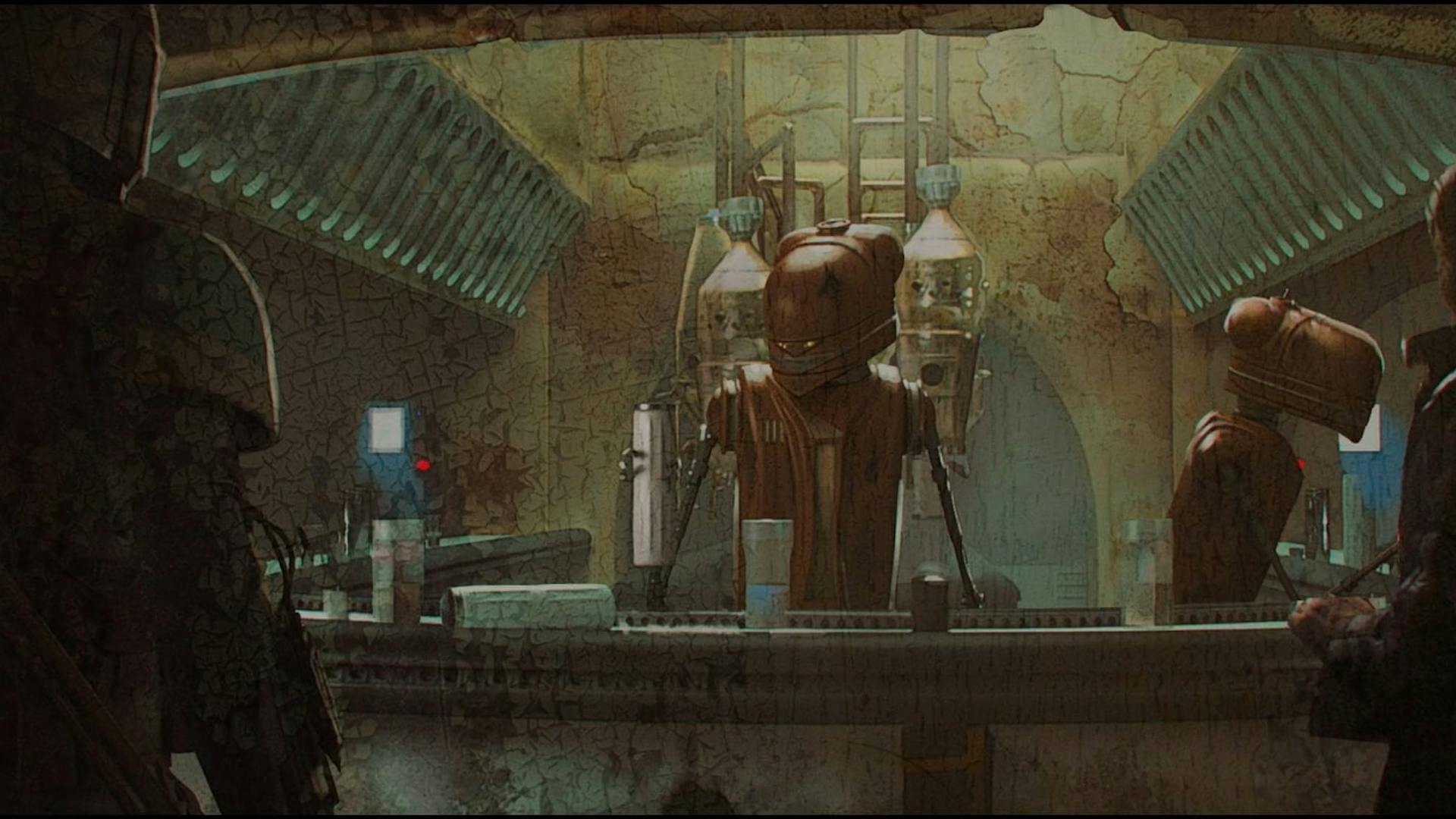These sequences set The Mandalorian apart from Star Wars movies and shows, and even from other series. We used concept art from the production to portray the events and characters from the episode just watched. Our artists treated the source imagery to create a gritty look, like a weathered painting, adding a physical element. Animated elements bring the paintings to life with subtle dimension and movement within scenes.