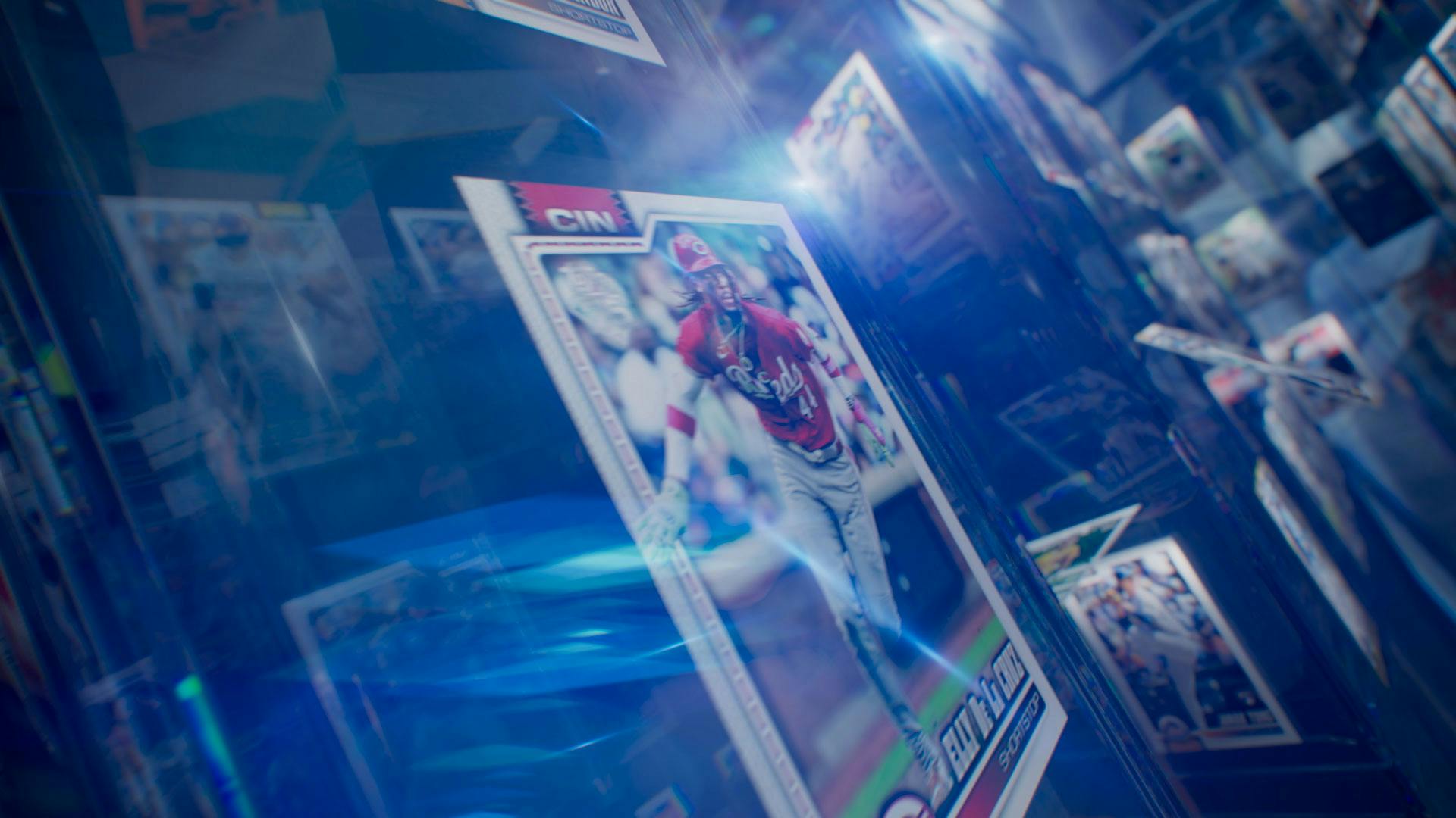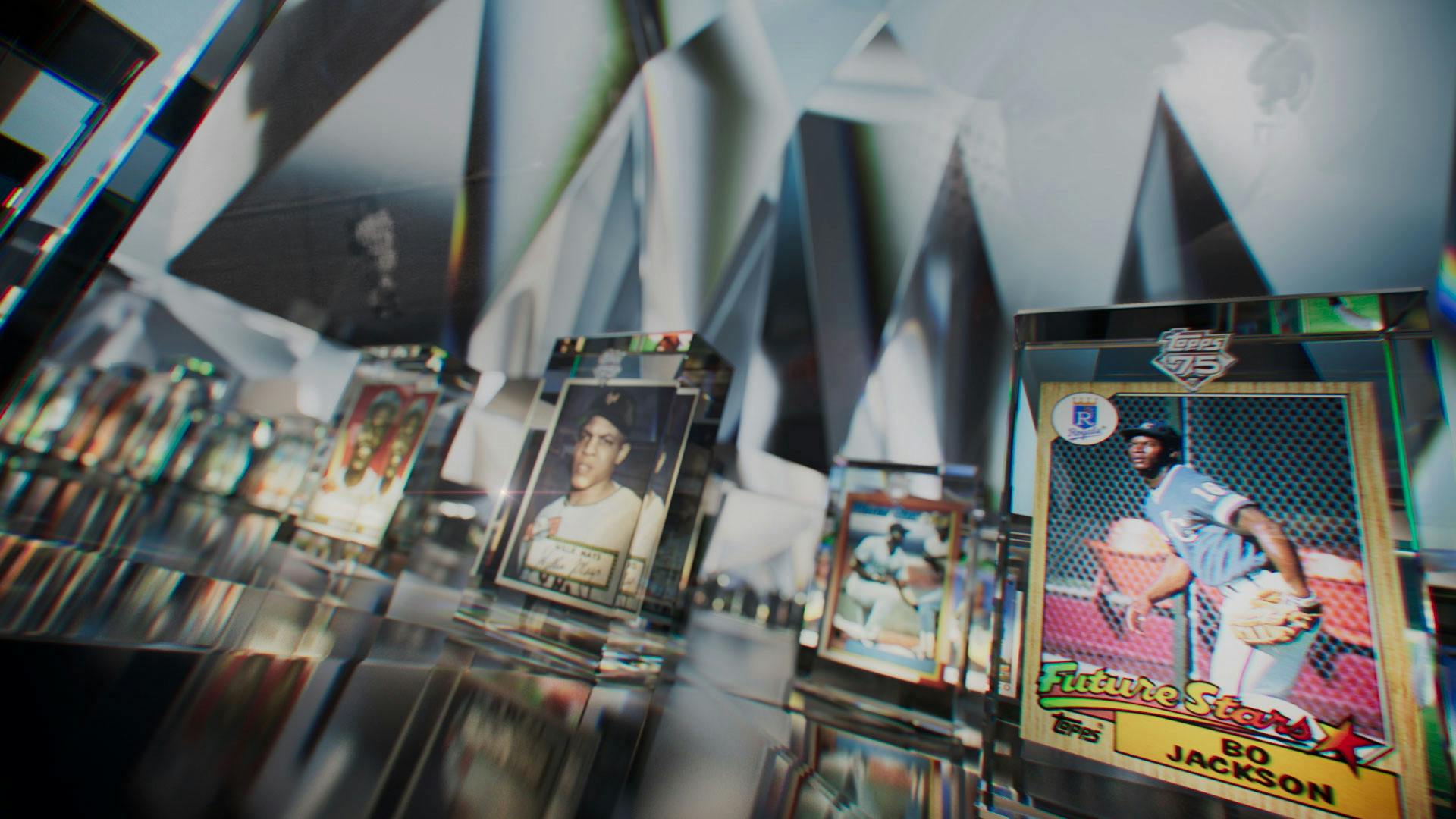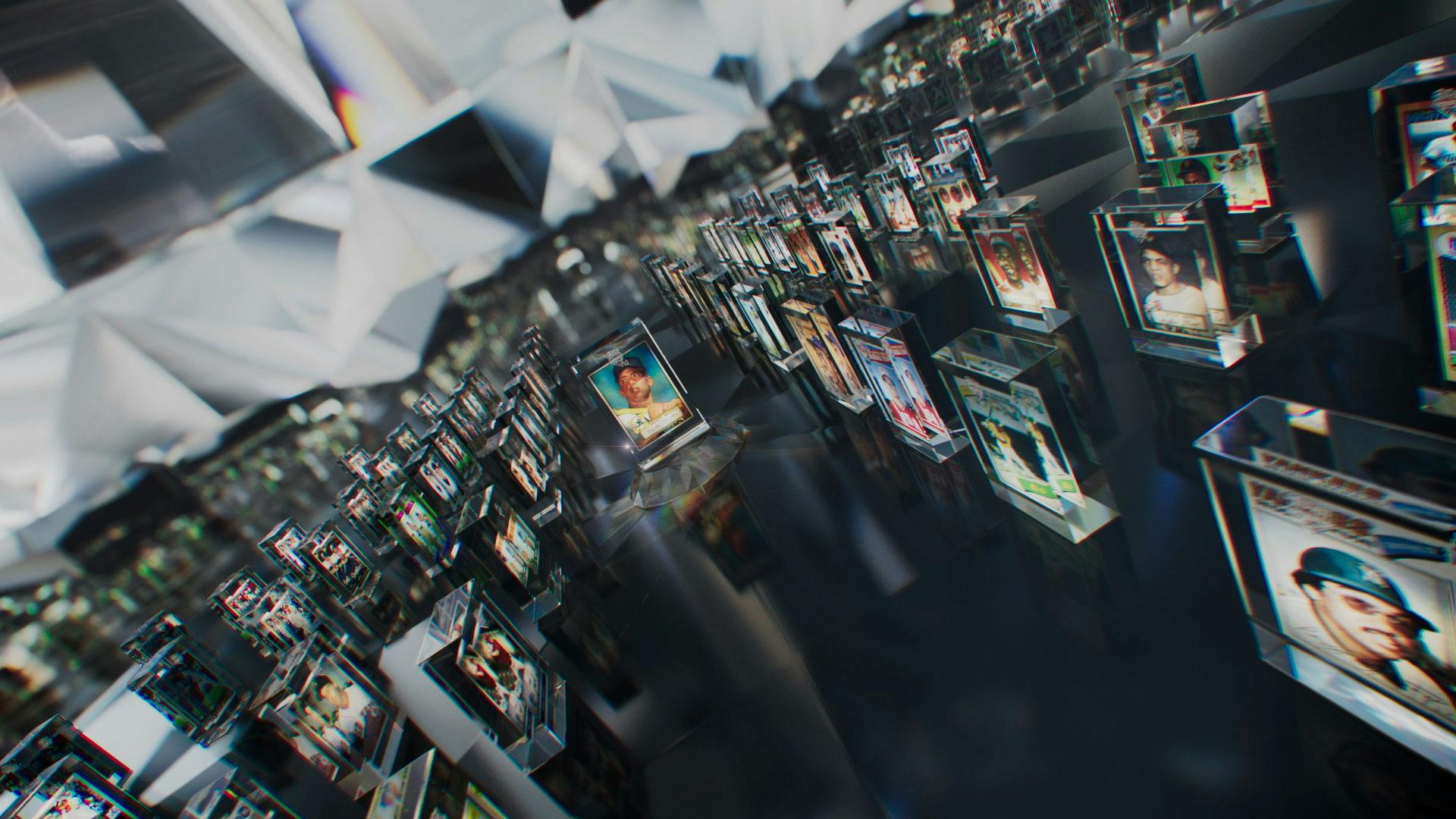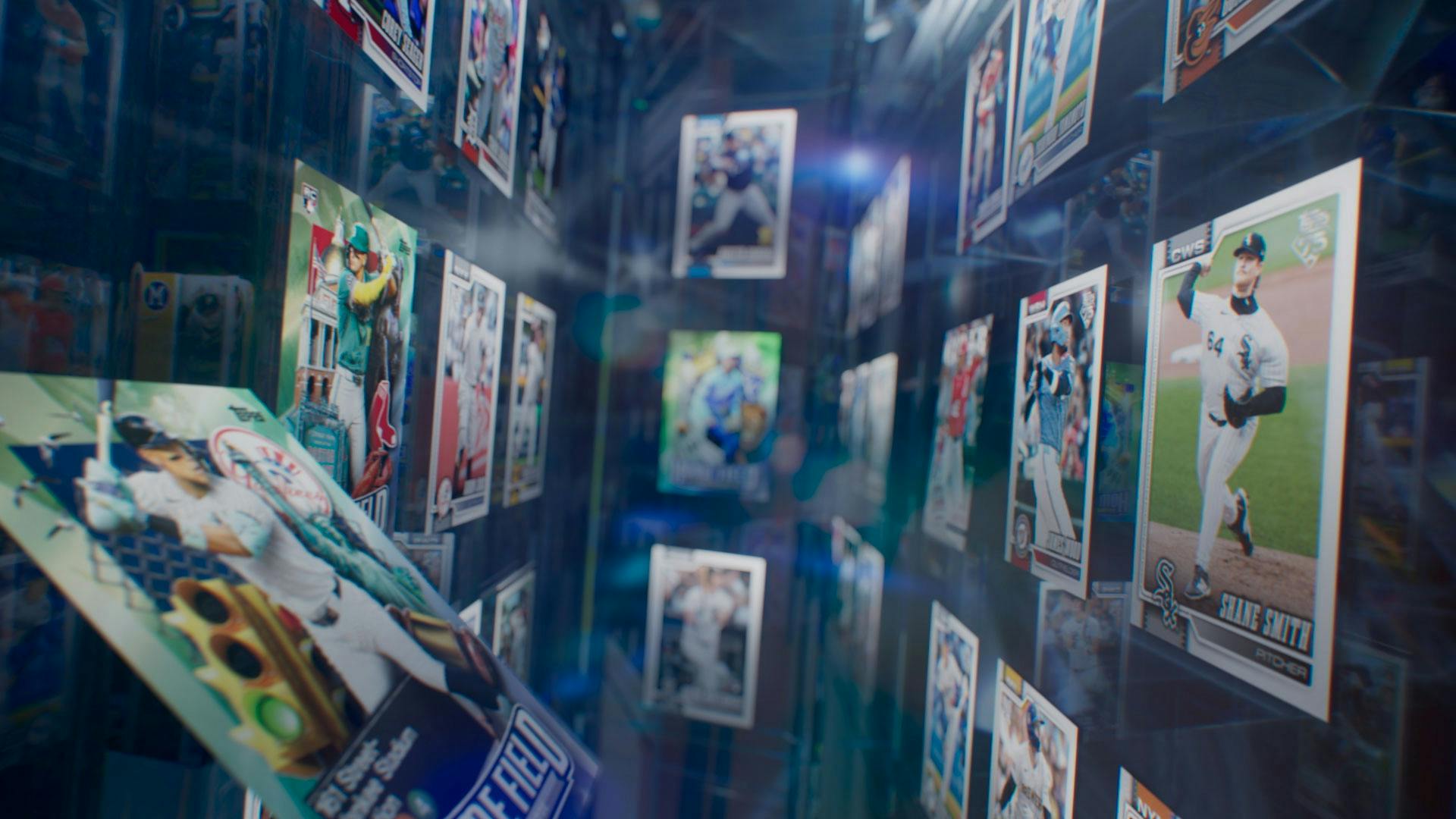 As the piece progresses, the environment evolves from reverent and classical to kinetic and contemporary, transitioning into a dynamic diamond world where new stars and new cards form in real time. The film culminates in a journey through a crystalline logo structure, and as the camera travels through, we see new cards being added and settling into its walls—an ever-growing monument to the game. The result is both a tribute and a forward-looking statement, blending motion design, editorial storytelling, and spatial world-building to celebrate 75 years of collecting, fandom, and baseball history.