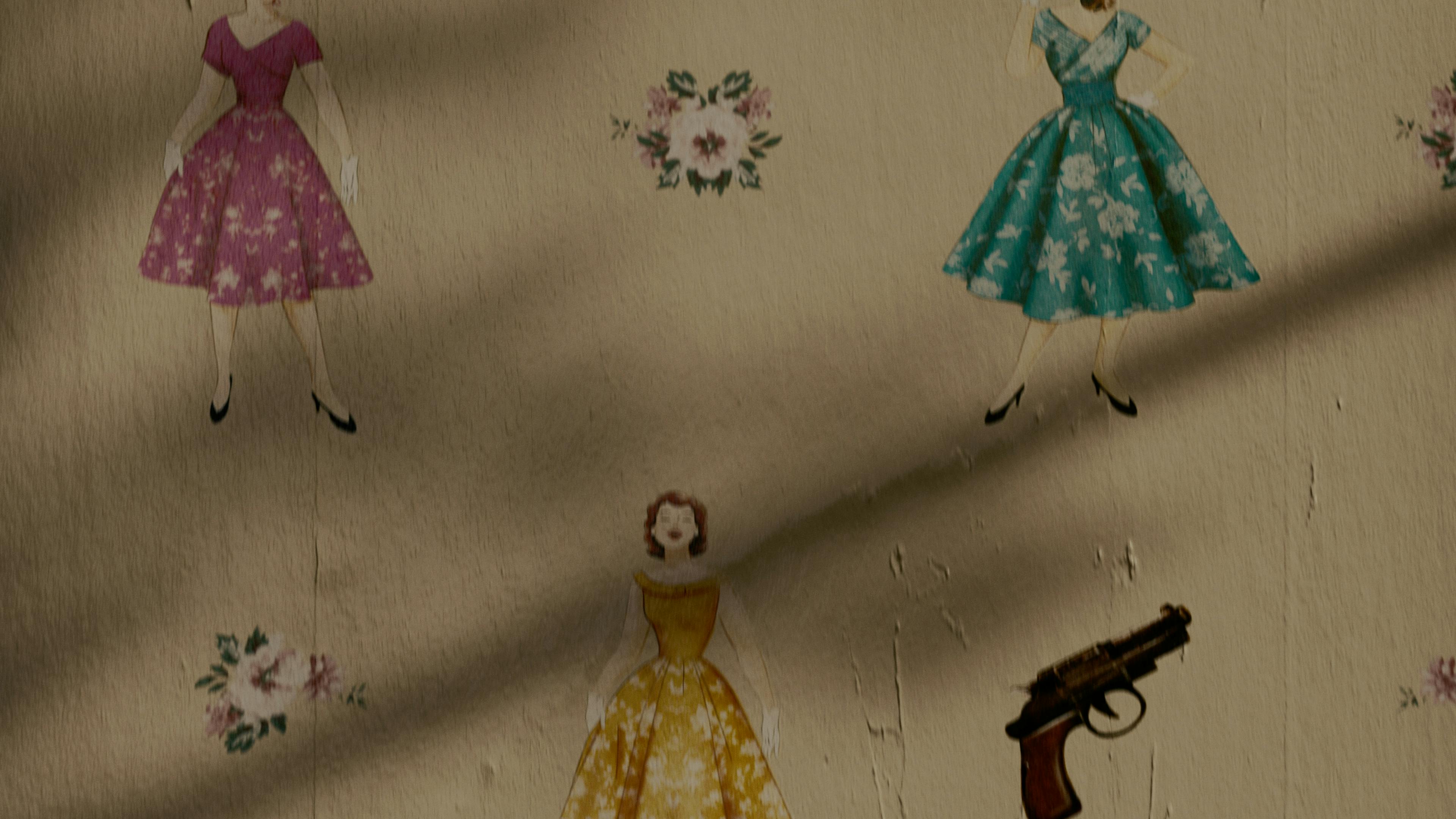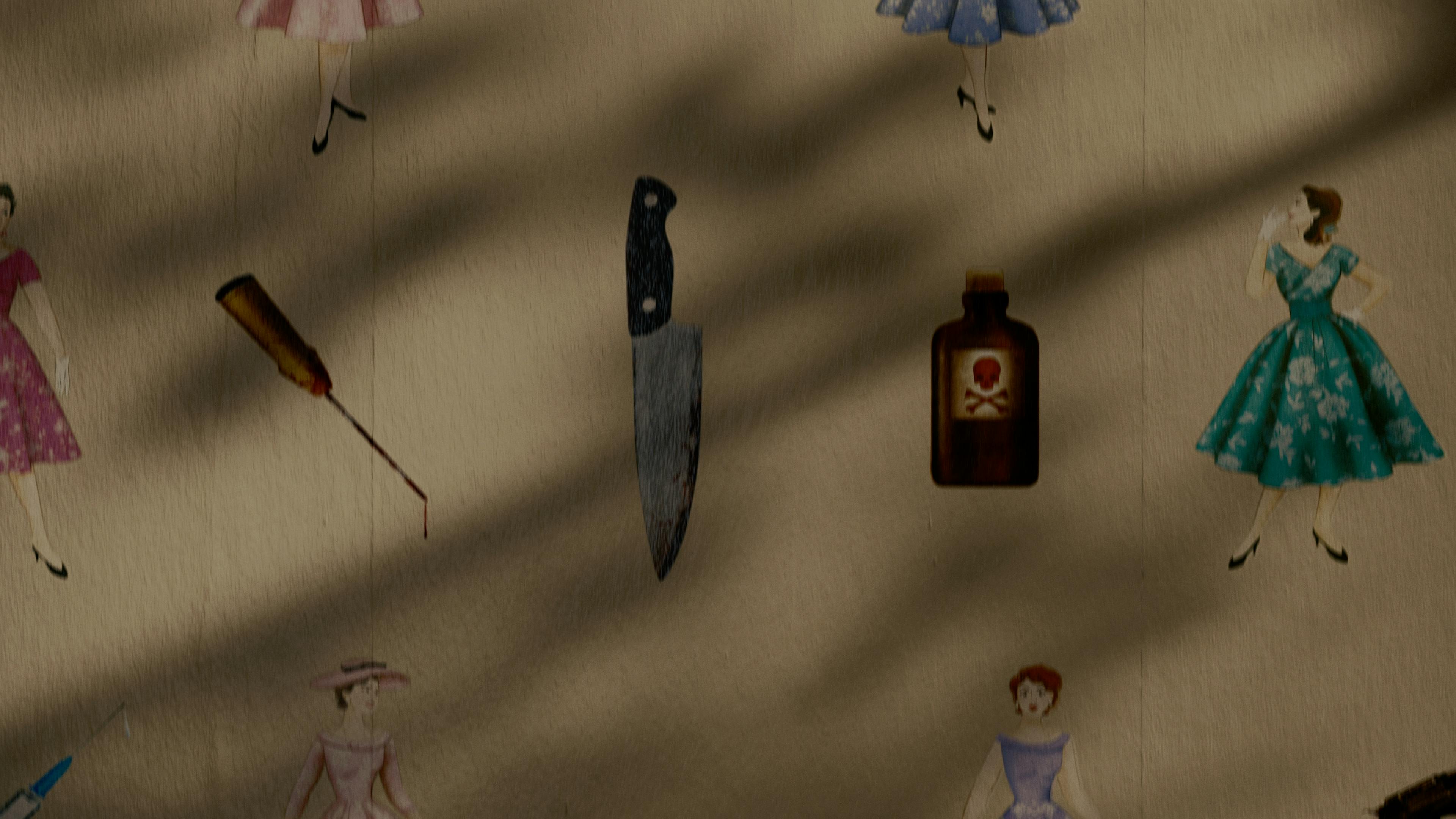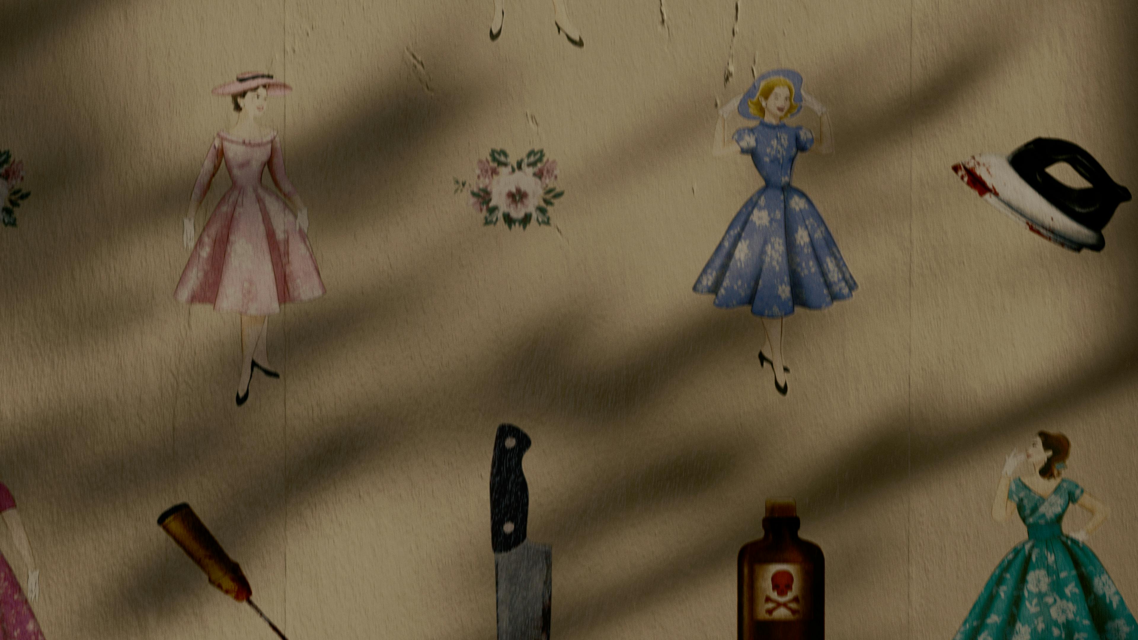 The second season of Why Women Kill brings back Marc Cherry’s brand of sinister fun in a story set in 1949 Los Angeles. The protagonist is a Plain Jane desperate to fit in with the stylish ladies of the Gardening Club. Inspired by the floral patterns of the period, we created a wallpaper that incorporates beautiful flowers, lovely housewives… and, of course, murder weapons. As we journey down the wall, the imagery gets a lot less wholesome, culminating with a hapless male victim at the bottom.