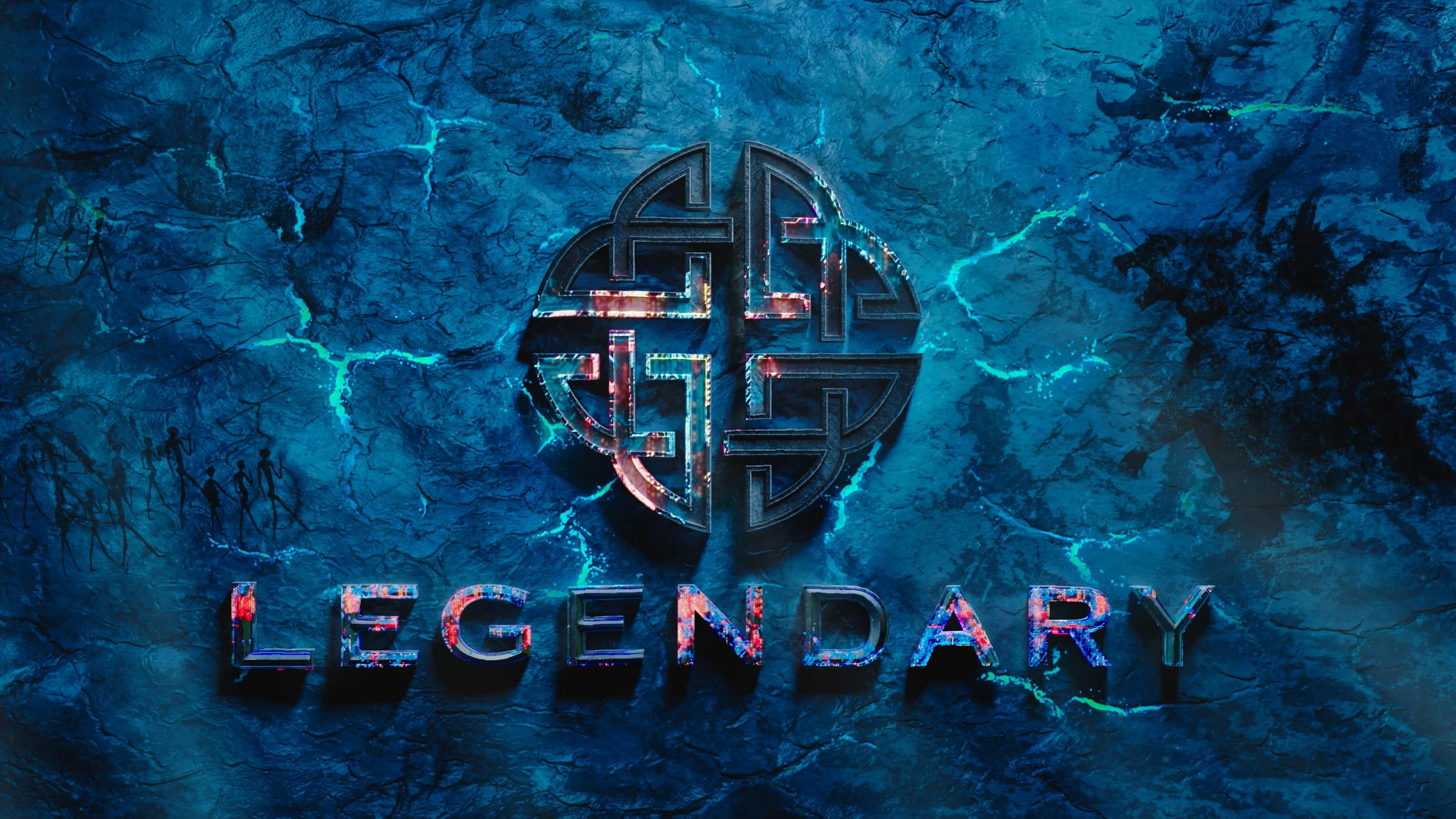 Mirroring the same rugged treatment, the Legendary logo is set into the Hollow Earth stone of a deep blue color to represent the amphibious Godzilla. The image of Godzilla opposite a group of ancient peoples encapsulates him as a prehistoric, dinosaur-like monster. An atomic blue glow pulses through the stone, lighting up the logo in a wave of spectral colors.